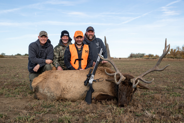 It’s not every day you get to kill your first bull elk with a legend. Fred Eichler, Mark Land, the author, and Byle Chadwick with the bull elk. Photo by Joe Vega – S&W