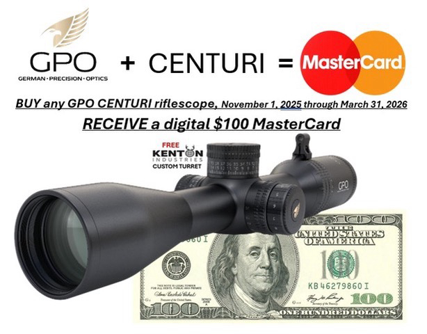 Richmond, VA. (October 29th, 2025) - German Precision Optics (GPO) is pleased to announce a $100 MasterCard Rebate on all production models of the famous GPO CENTURI Riflescope. This mail-in rebate offer will run from November 1, 2025, through March 31, 2026. Don’t miss your chance to own the riflescope that Field & Stream magazine called “one of the hottest riflescopes in the industry.”