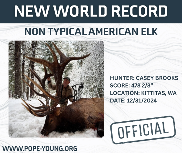 On December 31, 2024, Casey Brooks shot this record-breaking bull in Kittitas County, Washington. The bull has an official score of 478 2/8”, surpassing the previous Pope and Young World Record by an astounding 28 6/8”. This incredible bull is less than half an inch from the Boone & Crockett World Record, which would be the largest bull ever taken or found in North America, and Casey killed his bull with archery equipment, which is an outstanding accomplishment.