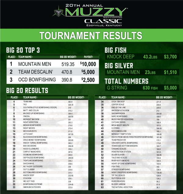 This year’s participants were on the mark, shooting thousands of pounds of non-desirable fish species. In true sportsman-like fashion all fish were removed from the water and donated to a local pet food processing facility. Over 14,000 pounds of rough fish were weighed in just as part of the Big 20 category! After three days of blood, sweat and tears Team Mountain Men dominated the field taking home first place honors for both the Big 20 and Largest Silver Carp categories with 519.35lbs for the Big 20 and 23lbs for the Silver Carp, respectively. Team Nock Deep’s 43.2lb fish secured the top of the podium while Team G String grabbed the numbers pot with a mind-blowing 630 fish! Meanwhile more than $20,000 in cash and prizes were earned and podium finishes were as follows: