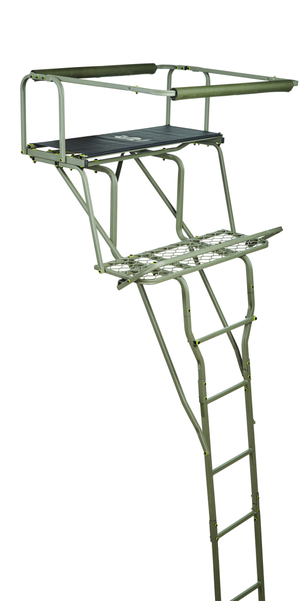 The two-man stand includes a padded flip-up shooting rest and can support a pair of hunters for a total of 500 pounds and weighs in at 70 pounds. MSRP for One-man ladder is $159.99; Two-Person Ladder $179.99.