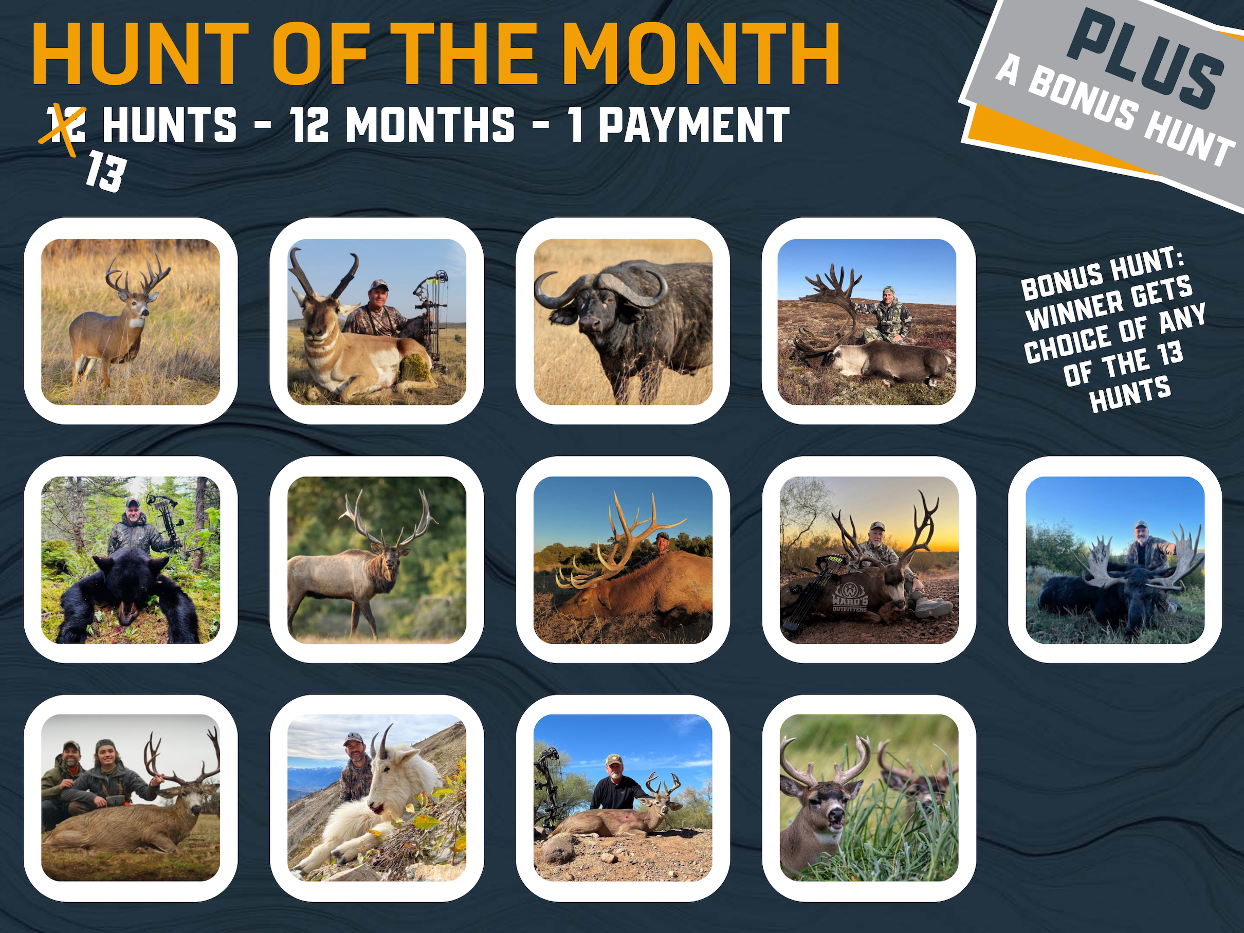BUT, right now when you buy the full raffle package ($1,200 value) you’ll get two entries into every monthly drawing PLUS a 1 in 400 chance at the BONUS HUNT, which is winners choice of any of these 13 incredible hunts.